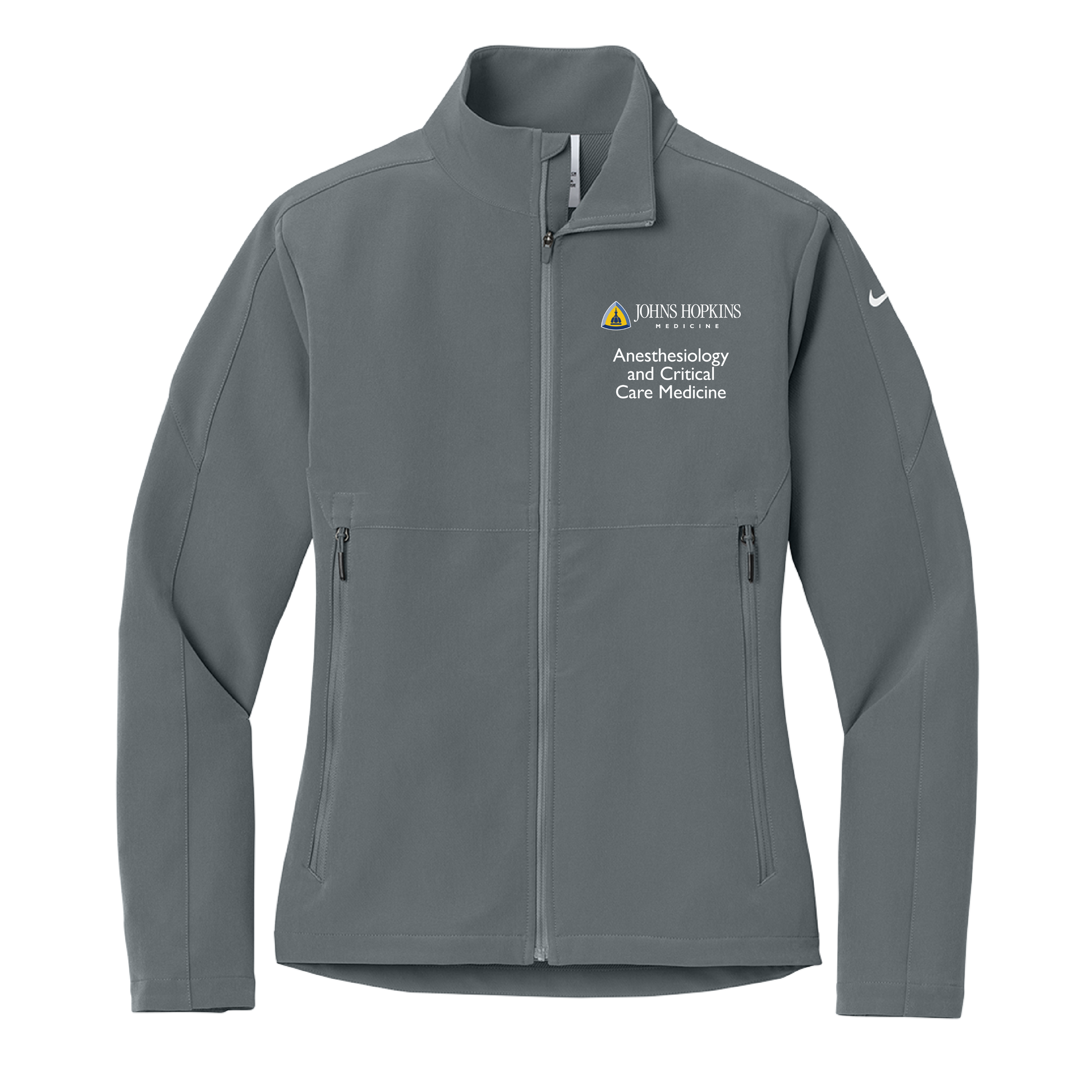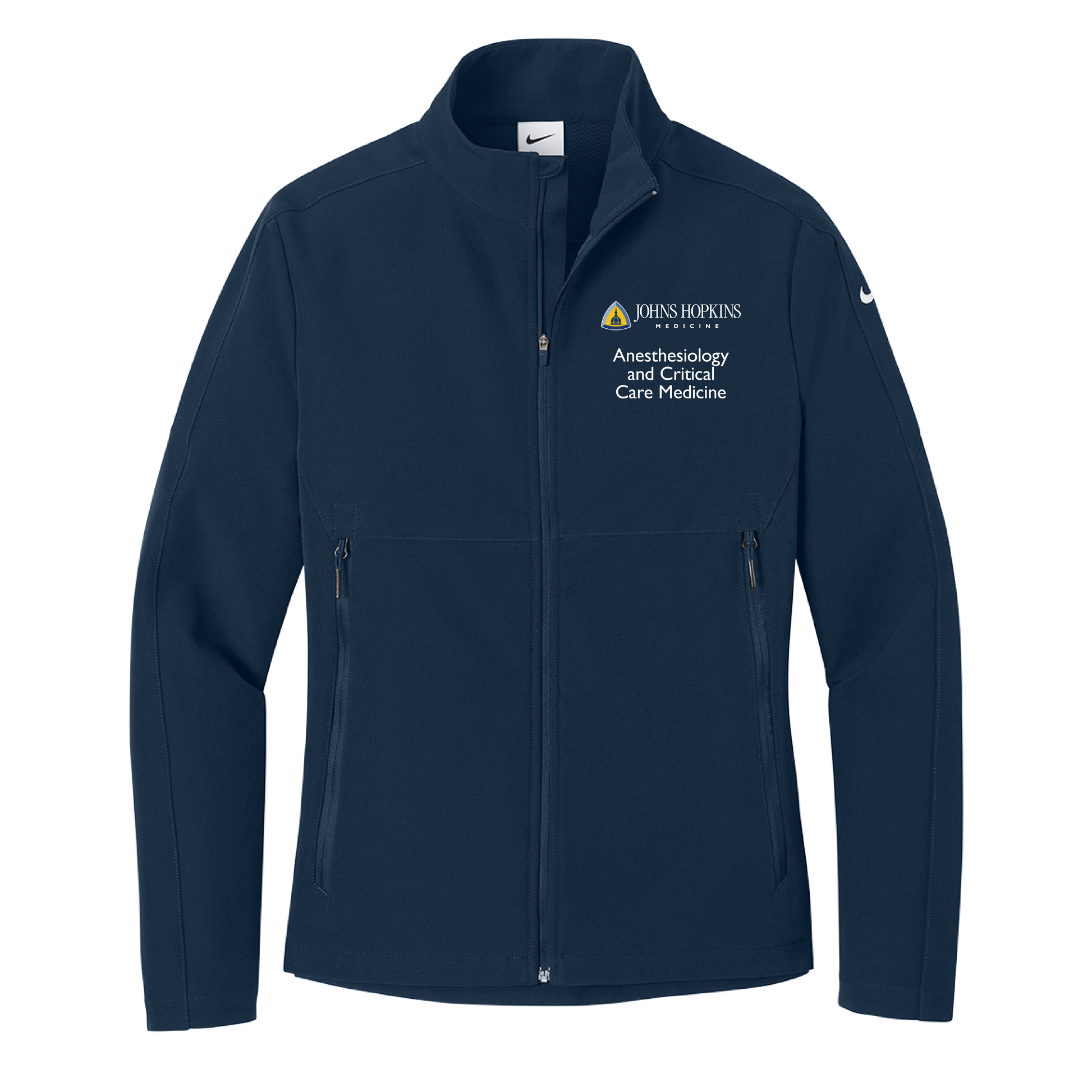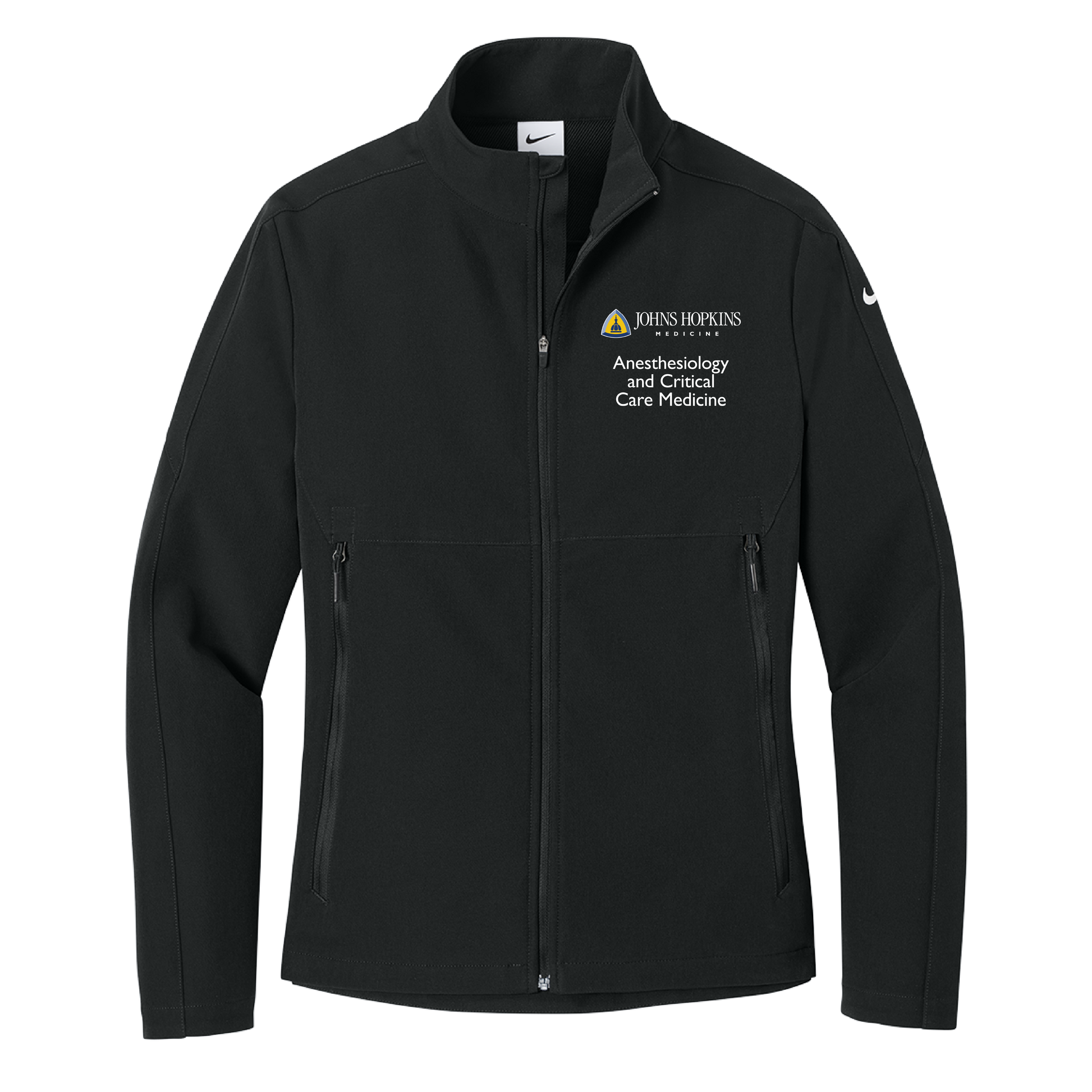 Johns Hopkins Anesthesia and Critical Care logo embroidered on the left chest and the option to personalize on the right chest.