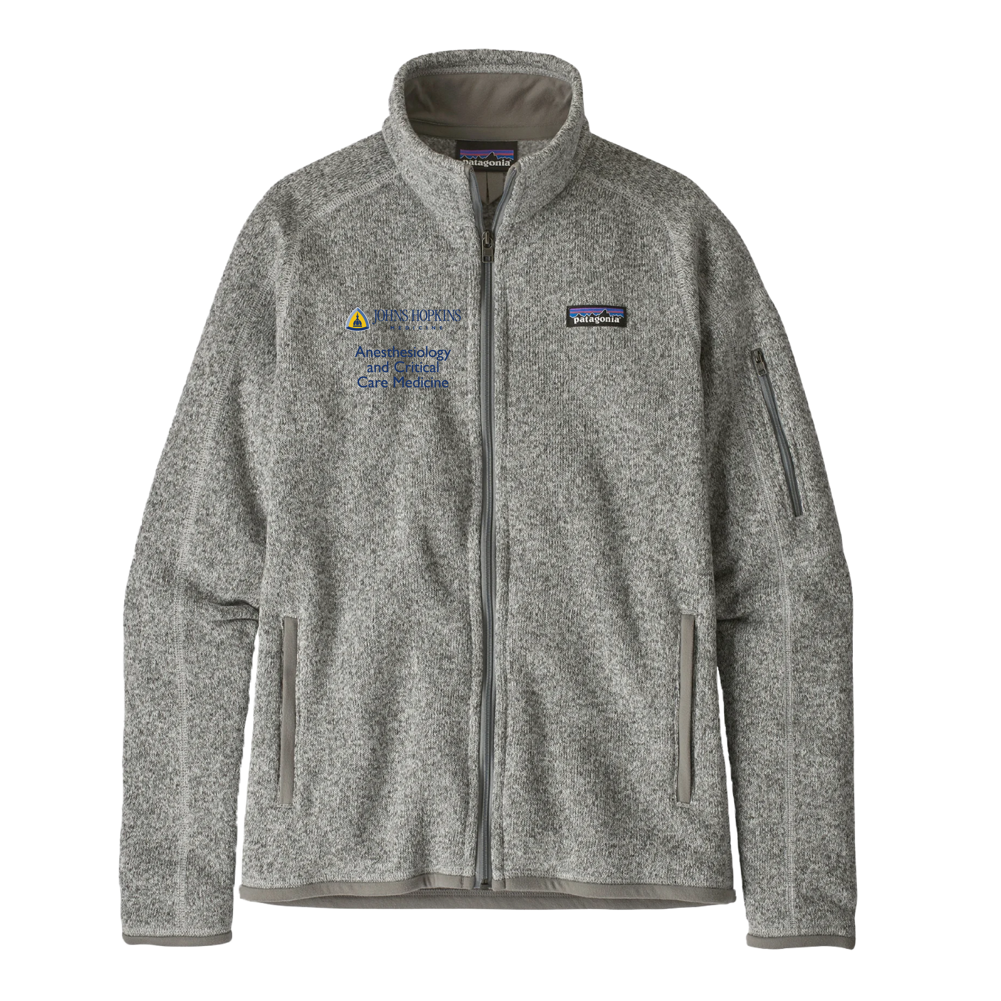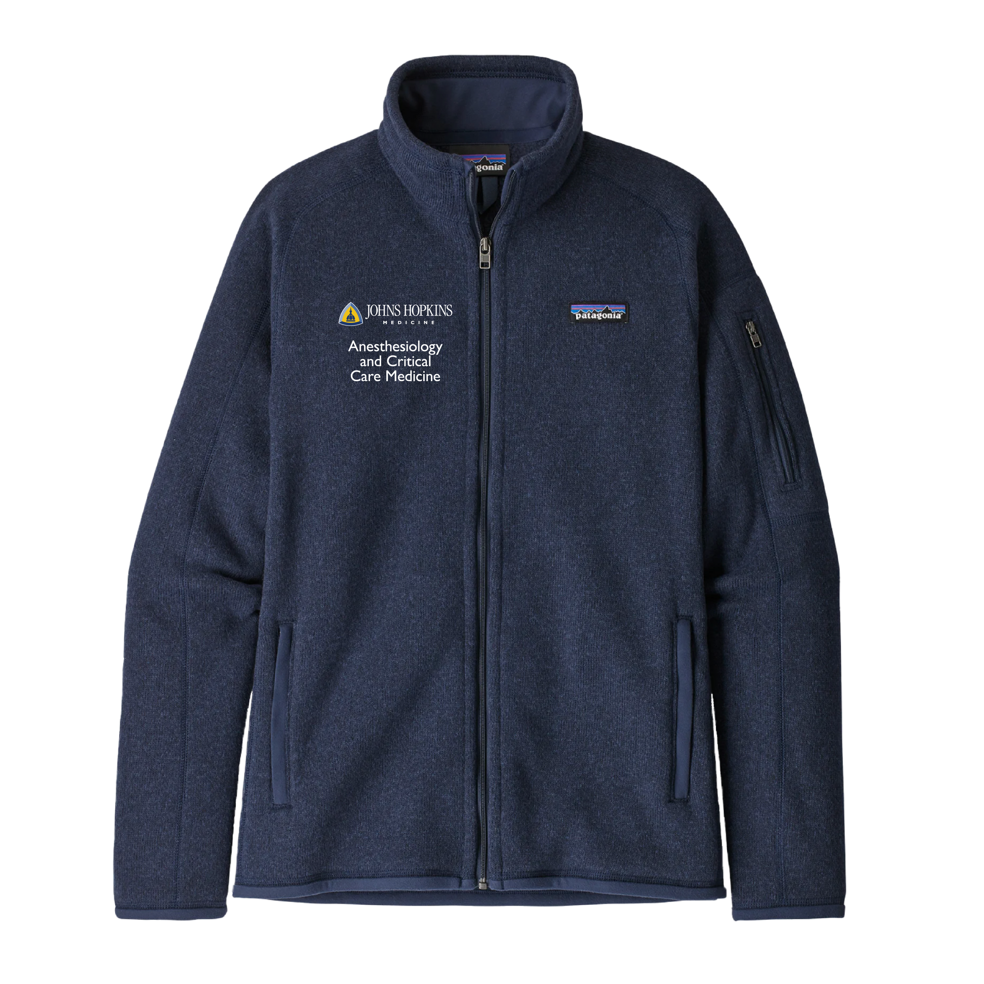 Johns Hopkins Anesthesia and Critical Care logo embroidered on the right chest and the option to personalize on the right arm.